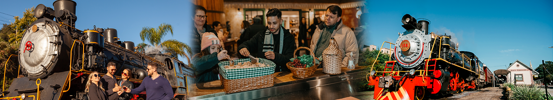Você ouve o apito. Os trilhos ganham vida e a locomotiva a vapor solta fumaça branca, como numa cena de filme antigo. É hora de embarcar. A vista da Serra Gaúcha passa suavemente pela janela enquanto músicos e artistas circulam pelos vagões, despertando sorrisos e memórias. No ar, o aroma inconfundível de vinho e uva anuncia que essa viagem será muito mais do que um simples passeio.